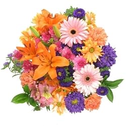 Direct From Our Farms, Flowers are handpicked from "Our Platinum Line", guaranteeing the Highest Quality of Flowers Grown; a hand tied designed bouquet ready to drop into your vase. Includes:. Meteor or Florette Asters, Gerbera Daisy, Asiatic Lilies, Cushiona and Daisy Pompoms, Alstroemeria, Large Carnations, Matsumot and Hannah Asters, accented with greens. Flowers arrive in our specially designed box to protect the quality and freshness during shipping with you personal message. Direct From Ou