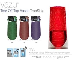 Vazu Collapsible Flower Vase - Transisto Red A flower vase like you've never seen before!It's thin as a sheet of paper when not in use, super strong, colorful, looks like glass when in use and totally cool!What a way to give flowers. The packaging is part of the vase, just tear off the top, add tap water and, presto chango, you've got a flower vase. You can even change the height by cutting some off the top.Made of plastic and will not leak. It is transparent, glossy and totally stable. Measures 11 1/4"H, 6.25"W at base, 5.5"W at top.
