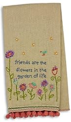 This cheerful embroidered linen hand towel by Natural Life is embellished with beads and trim. The towel will add color and decoration to any kitchen or bathroom. Inspirational quotation, friends are the flowers in the garden of life is beautifully embroidered on a tan towel with sweet red, purple and orange flowers. It is a wonderful gift to give a friend and great gift to give a friend that enjoys gardening. Natural Life was founded in 1996 by a woman who was inspired by her mother's passion for making and creating gifts and treasures.