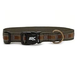 Durable designer dog collar adjustable 16 inch - 24 inch. It features a unique brass and pewter hardware as well as withstands over 600 pound test weight on buckle. This collar has 100 percent nylon webbing and is made in USA.
