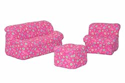 This set of foam furniture is designed only for kids, scaled down just right. Kids like when they have their own unique furniture, with the intention of "No Adults Allowed!”In this set, they get their own mini sofa, chair and ottoman covered in fun, expressive fabrics. They will find so many ways to use their furniture set, and their friends will love it too. Item is perfect for slumber parties. Light weight for easy handling.3 Piece Mini Children's Pink Flower Mushroom Sofa Set. Sofa Dimensions: 34"L x 19 1/2"W x 16 1/2"H Chair Dimensions: 20"L x 19"W x 16 1/2"H Ottoman Dimensions: 13 1/2"L x 13 1/2"W x 9 1/2"H. Finish: Pink Flower: Poly-Cotton and Polyurethane Foam. Item is made in USA.