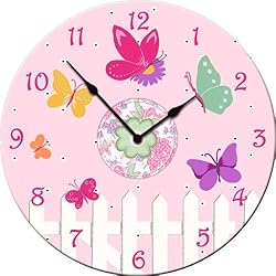 "Retro brightly colored butterflies flutter above a white picket fence making this clock simply sweet, by designer Jenny Mountjoy. Little white daisies on a pink background. What more could a little girl ask for? Great for nursery or bedroom. Giclée printed onto real cotton cloth. Measures 10 inches in diameter. Quartz movement. AA battery required."