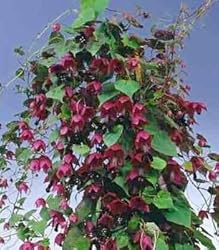 Extremely beautiful rapid growing climber that starts flowering in June and continues until the frosts in the fall. Delightful parasol-shaped fuchsia pink calyx with black/purple to crimson 3" flowers within. Can be used in sunny pergolas, porches, trellises, hanging baskets, even walls. Proper name: Rhodochiton