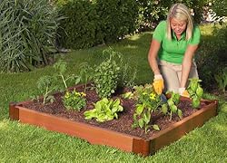 Growing vegetables in this 4' x 4' X 6" high, easily accessible Raised Garden is a joy and relieves stress. A ‘Frame It All’ raised garden greatly improves your odds of harvesting a bountiful crop of healthy, robust vegetables and plants. The strong durable composite timbers are hollow and retain the heat of the sunshine to difuse the heat throughout the night to and keep the soil at a constant temperature.Manufactured from 60% recycled, post-consumer plastic and 40% wood flour, the Eco-friendly durable composite wood grain plastic timbers, which never rot, splinter or lose their color - which just weathers naturally like real wood, locate into brackets on the joint stakes, which are hammered into the ground. Raised gardens are easy to manage by people of all ages. No back-breaking effort is required to teach even the youngest children the joys of growing and gardening. Kit contains 4 Stacking Joints, 4 Composite Timbers, and all necessary hardware.