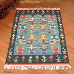 NOVICA, in association with National Geographic, offers thousands of limited edition and one-of-a-kind gifts, jewelry, and home decor treasures handmade by master artists and artisans throughout the world. Flowers burst into bloom as springtime comes to the Andes. Scattered across serene fields of blue, bright petals and green leaves infuse any setting with sensations of peace. Efrain Curi works on the Andean handloom, transforming virgin wool into a masterpiece rug that bears his signature. Titled "Flor primaveral" in Spanish. Artisan Info: Born in the state of Huancavelica, Efrain Curi first learned the flat weave technique in his uncle's workshop, in what is a family craft. Finding words to express his thoughts and ideas is difficult for Curi since his first language is Quechua, but he speaks eloquently through his work. He prefers natural fibers such as wool and cotton tinted with natural and artificial dyes. His tool is the handloom and he usually weaves in the company of his family. The children find it fun to help out, and Curi hopes to eventually teach them all he knows about weaving. He has exhibited his work and won prizes for it in contests such as one organized by a wool company, where he took first place in 2000 and second place in 2001. "I have put a great deal of effort to being where I am today," he says. "My goal is to become recognized as a master weaver, but that will take many more years. I feel appreciation for everything I make. I pause to observe my work