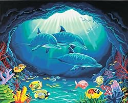 Take a dip with our dolphins and find underwater treasure. Our kit includes acrylic paints, high quality acrylic paints, pre-printed textured art board, and a paintbrush. Finished Size: 20-inches-by-16-inches