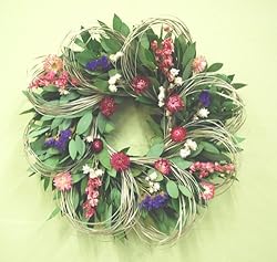 Spring flowers peaking out of beargrass loops on a bed of fragrant Oregon myrtle bring a bit of spring indoors. Colorful flowers include ammobium, strawflower statice and larkspur. About 19 inches across.