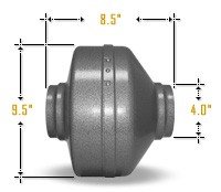 Vortex PowerFans' high performance inline duct blowers feature high power motors and an aerodynamically designed shape. These high performance inline blowers feature superior quality steel construction and baked epoxy paint finish. They have a convenient "tape flange" that allows you to place the ducting on the blower and tape it in place easily! Balanced motors with permanently lubricated ball bearings ensure vibration-free operation. Proudly made in Canada by Atmosphere, the Vortex Powerfans are also the first industrial inline duct fans that comes with a power cord, ready to plug in, installed by the manufacturer. These blowers feature a 5 year warranty. Vortex Powerfans are performance, reliability, and quality all wrapped up into one package. Includes galvanized mounting brackets for horizontal or vertical installation.Specifications:Size = 4", Diameter = 9.5", Length = 8.5", CFM = 172, Amps = .65, Watts = 80, RPM = 2500, dBA = 49