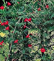 Deeply fringed foliage, 2" long flowers. Add a tropical feel to your garden. Unique 2" scarlet, trumpet shaped flowers bloom all summer long. Great vine for partial shade. Attracts hummingbirds. Ht.15'. Space 8-10" apart. Annual. Proper name: Ipomoea (Quamoclit)