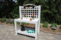 Keep your pots and planting work organized using the Dura-Trel Berkshire Potting Bench. This handy bench is the perfect compliment for experienced gardeners and novices alike, and will make your planting much more manageable with its open and sturdy construction. The slatted bottom shelf is great for keeping wet or moist items, making it the perfect storage space for mulches and soils. The main surface measures a generous 43 inches wide by 22 inches deep, allowing for plenty of working room. Lattice behind this shelf offers a place to temporarily hang tools and adds a graceful look to the piece. Topping the unit off is a small top shelf that runs the length of the bench for extra storage or for placing tools, seeds, and small potted items. This bench is constructed with the highest quality vinyl, containing the greatest concentration of titanium dioxide available. This compound acts as a powerful ultraviolet stabilizer, protecting the vinyl from the rays of the sun. This potting bench will never fade, crack, peel, or rot, and its white color will remain vibrant for years to come. Clean the unit simply using soap and water or spray it with a garden hose. The sturdy legs enable the unit to be placed on any flat surface, for use in your garage or garden. Create an organized workspace using this Berkshire Potting Bench. Assembly required. Made in the USA. Twenty year guarantee.