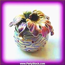 Any Orchid Lover would love this colorful blossom!Meticulously hand enameled in shades of teal, purple and gold.We've setthis box with Swarovski crystals for lots of sparkle. Below the flower, the round box is exquisitely engraved with a whimsical pattern and hand enameled in a soft Lavender hue(also available in a warm, golden-brown enamel). Perfect for jewelry or keepsakes.