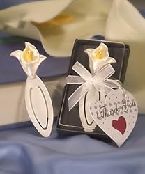 Give your guests a flowery reminder of your day with these elegant calla lily bookmark favors. With these favors, each time your guests curl up with a good book, memories of the moments that made your event so special will be easy to recall. Designed with a white and yellow resin calla lily bloom with a shiny rhinestone center sitting on a metal clip, each is 3 In. X 1 In. Bookmarks always make festive and useful party favors and the 'Marks of Excellence' bookmarks collection offers something for every occasion. Each comes individually packaged in a deluxe clear topped gift box with a black bottom, tied with a white organza bow and attached heart shaped thank you tag.