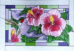 Rendered in vibrant color and magnificent detail, this hand-painted art glass panel captures the exquisite beauty of a hummingbird hovering before a hibiscus flower. This top quality window or wall hanging features two soldered metal rings along the top. It measures 20.5" wide x 14" high. We will include a chain hanging kit with each picture. This is a custom order, and the average receipt time is 7 to 10 business days from time of order. The picture is shipped from the manufacturer.