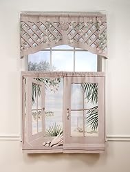 Our beautiful Window Art curtain creates the illusion of looking out your window at a beautiful beach, complete with a tranquil ocean and swaying palm trees. Easy care, machine washable polyester/cotton fabric makes this a smart choice. Island Retreat offers tier curtains in 44"x24" and 44"x36" lengths as well as 48"x19" valance. Scene painted by muralist Louise Hamel. Imported.