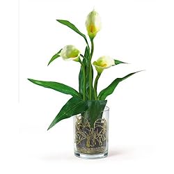 This beautiful Calla arrangement will brighten the decor of any room. Crafted from latex, the flowers have a realistic look and feel. The leaves are made from beautiful silk. A glass vase is filled with artificial soil and roots, creating such a realistic look even you will question its authenticity. Available in your choice of white or mauve, it's the perfect way to brighten your home all year round. Color: Cream, Height: 14" Vase: H 4-3/4" W 3-1/2"
