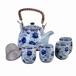 This elegant but traditional Chinese tea set in a blue floral pattern is a great colorful additional to anyone's dishes, and would make a treasured gift. There are four traditional porcelain cups with no handles and a teapot that includes a removable mesh diffuser for brewing loose tea. To top off the Asian look, the pot has a woven, removable bamboo handle.
