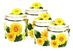 Take a look at this BEAUTIFUL Set of BRAND NEW Sunflower AIRTIGHT Canister Set of four. This is definately a very elegant set that would make a great addition to your decor!! Each canister seals airtight with a latch and rubber seal to keep the freshness in and the bugs out.Each canister is design in with a beautiful gingham sunflower design. There are large 3-Dimensional and life-size sunflowers surrounding each canister. The lids even have embossed sunflowers on it. Each leaf has gold trimming on it. The detail and color is so beautiful - they look so real! The largest canister measures approx. 9.5" tall and 8" wide (from Sunflower to Sunflower); the smallest canister measures approx. 6" tall and 7.5" wide (from Sunflower to Sunflower). Each canister is made of ceramic with a very fine gloss finish coating each piece.This would really brighten up any kitchen with a very elegant touch. This would also make a wonderful gift for any Sunflower lover or fan. Don't forget to take a look at our many other Sunflower items of this same design set and other styles. Thanks for looking =).
