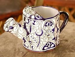 NOVICA, in association with National Geographic, offers thousands of limited edition and one-of-a-kind gifts, jewelry, and home decor treasures handmade by master artists and artisans throughout the world. Raindrops of blue petals cascade and replenish this hand-crafted watering pot. The design is at once soothing and mesmerizing, evoking the functional delicacy of this unique adornment. Perfect for the green thumb. The work of the Castillo Family represents part of the cultural and historical values of the state of Guanajuato, where they elaborate their treasured craft. Each piece is a laborious affair between the artisan and carefully selected clay, ensuring quality rather than quantity. Once the desired shape is achieved, the surface is prepared in a mineral glaze and fired in a brick kiln. Patience and artistic virtue result in a captivating rendition of Talavera-style ceramics. Artisan Info: The Castillo family's artistry has been featured in periodicals ranging from Sunset magazine to The Cincinnati Inquirer. The Castillo family has many years of experience hand-crafting Talavera-style ceramics in Guanajuato, Mexico. Their workshop seeks to rescue this traditional, world-renowned ceramic style. Although true Talavera ceramics are made only in the city of Puebla, the techniques are also practiced by artisans in Guanajuato. Talavera dates from the colonial period when Spanish priests taught indigenous peoples to craft ceramics using Majolica techniques. Over the centuries,