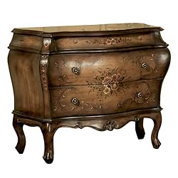 The unique exterior of this hall chest features a warm brown antiqued and distressed hand painted finish.Hand painted floral details highlight 3 drawer faces and corner posts.Hand carved details in skirt and feet compliment antique brass hardware.Fully assembled.