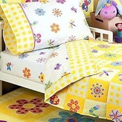 Have a little bit of summer time all year round with our Flowerland Bedding! Our ultra soft comforter is made of 100% cotton and has a lighter weight fill, which is very comfortable for your little ones! The top features colorful flowers, dragonflies, inchworms, bumblebees, and lady bugs on sunny yellow backgrounds with a coordinating gingham print. Outline stitching around each square gives the comforter a classic quilted look- an Olive Kids exclusive! The reverse is our coordinating yellow and white gingham print.Our Flowerland sheets are 100% ultra soft cotton as well. They are decorated with colorful dragonflies, inchworms, ladybugs, geometric flowers and more! The fitted sheet is made to fit a toddler bed/crib mattress. The pillowcase is hemmed with a coordinating yellow and white gingham print. The hem is folded and sewn, then bordered with an attached fanciful pink ribbon trim.